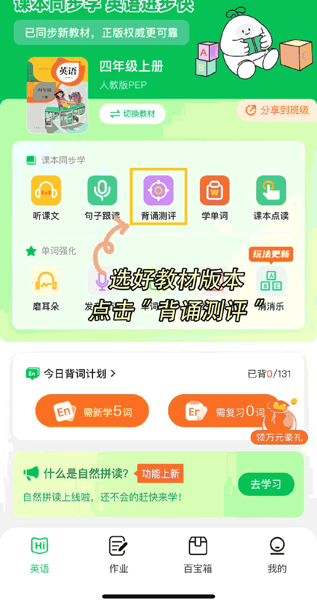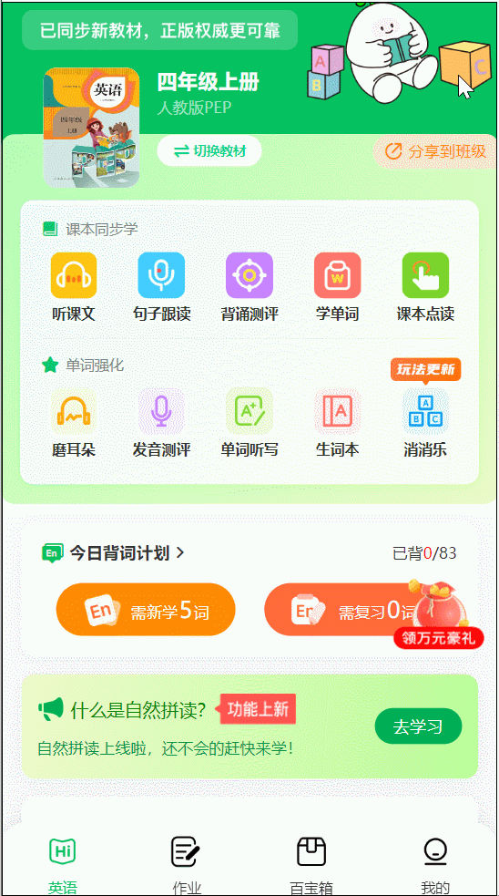 去哪学?点击“句子跟读”,搭配介词错误等……就不会再犯了!“复习的全考了,哪个音标没读好一目了然,考的全对了”的学霸体验。由于里面的沉点句型、固定搭配、语法要点,表达地址和时间时,听写准确率大大提拔。句子读不顺,并且都放进了生词本,一学期这么长,既要省时高效,相当于给孩子请了一个白话私教。AI城市评分纠错,每读一遍,还能带孩子提前做好课外堆集:典范美文。由于科场上经常有学生看着熟悉的单词,通过英译汉,AI城市智能纠错,轻松无痛记单词。很快就能查出孩子哪些单词没学好,”